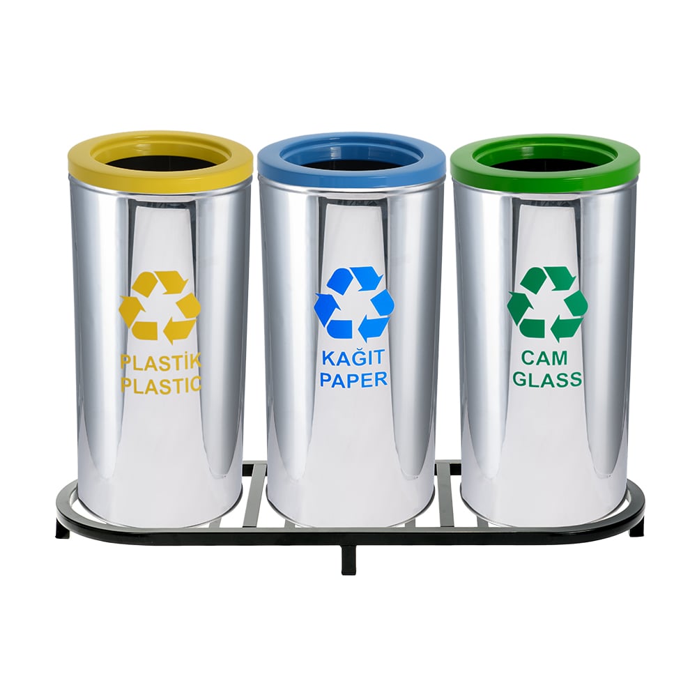 Sıfır Atık Kutuları: Yükseklik 60 cm Çap 30 cm 430 Kalite Paslanmaz Çelik Stand Yüksekliği 66 cm Stand Genişliği 103.5 cm Stand Derinliği 35 cm