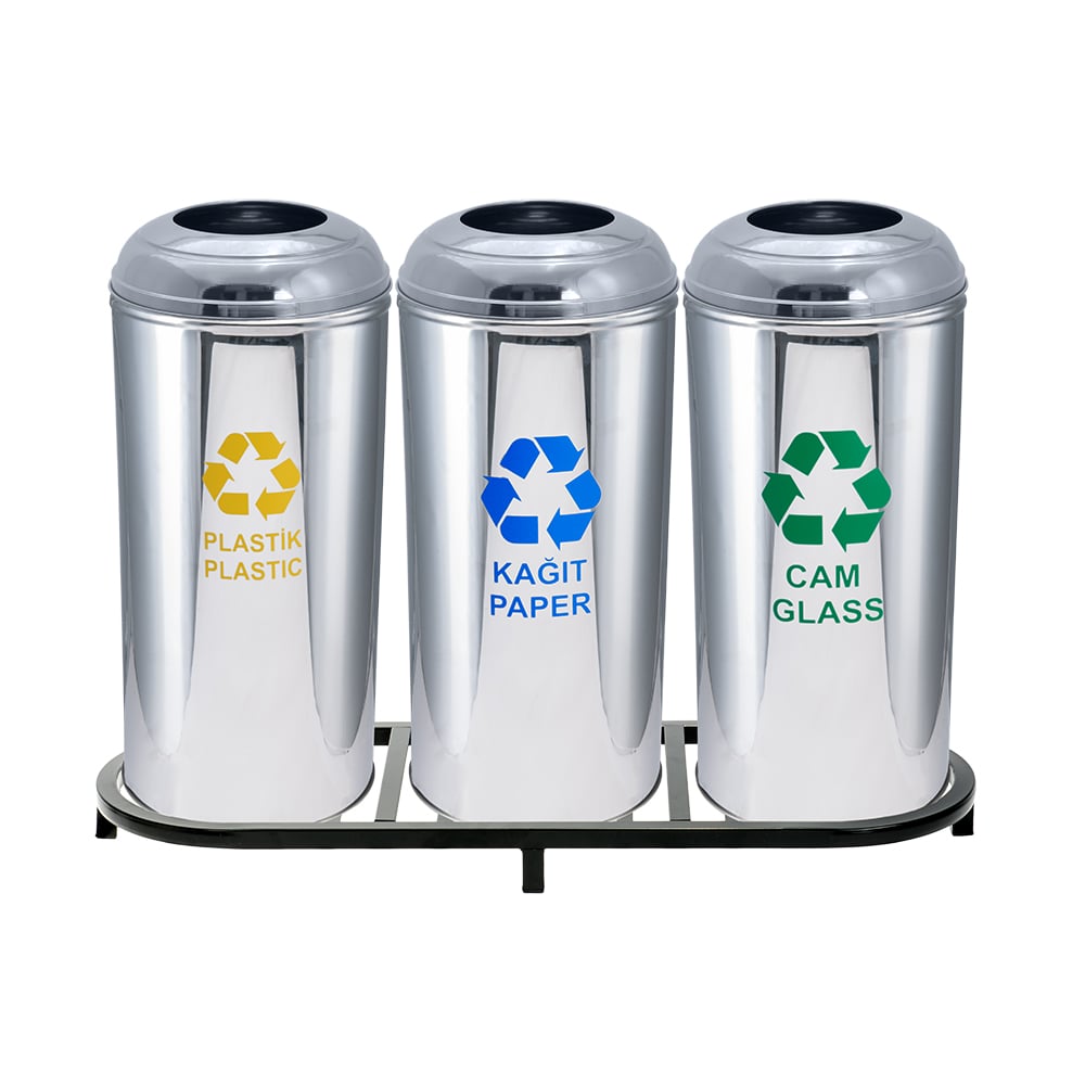 Sıfır Atık Kutuları: Yükseklik 68 cm Çap 30 cm 430 Kalite Paslanmaz Çelik Stand Yüksekliği 73 cm Stand Genişliği 103.5 cm Stand Derinliği 36 cm